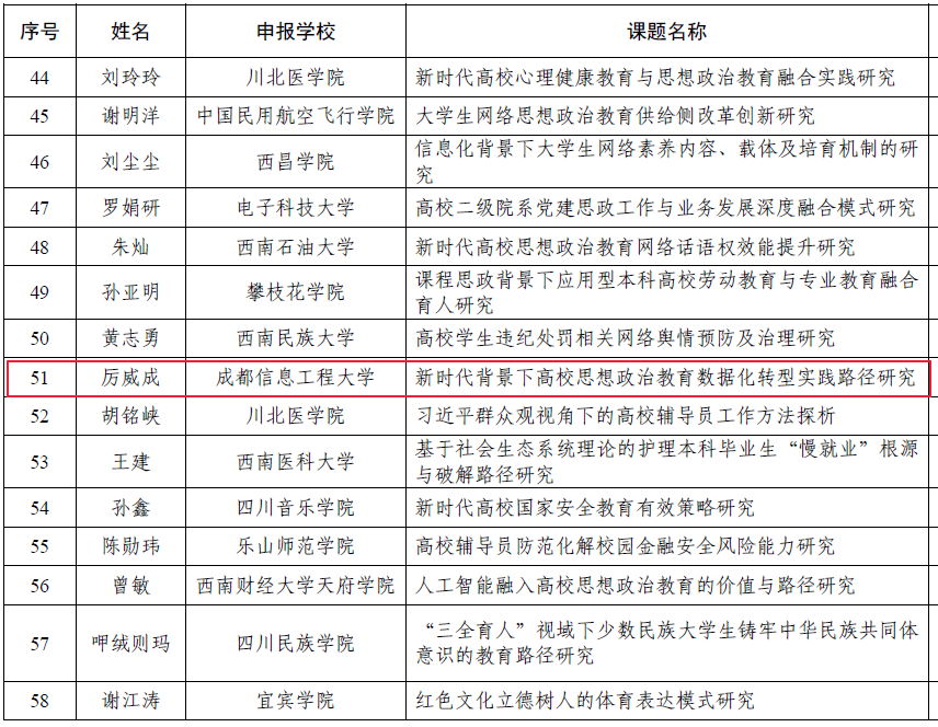 积极组织开展进行研究课题申报工作。2023年四川省教育厅、高校思想政治工作队伍培训研修中心(西南交通大学)思想政治教育研究课题(高校辅导员专项),共立项107项,其中,我院党委副书记厉威成主持,江玉菡、岳旭媛、张梦琪参与申报的项目《新时代背景下高校思想政治教育数据化转型实践路径研究》立项成功。