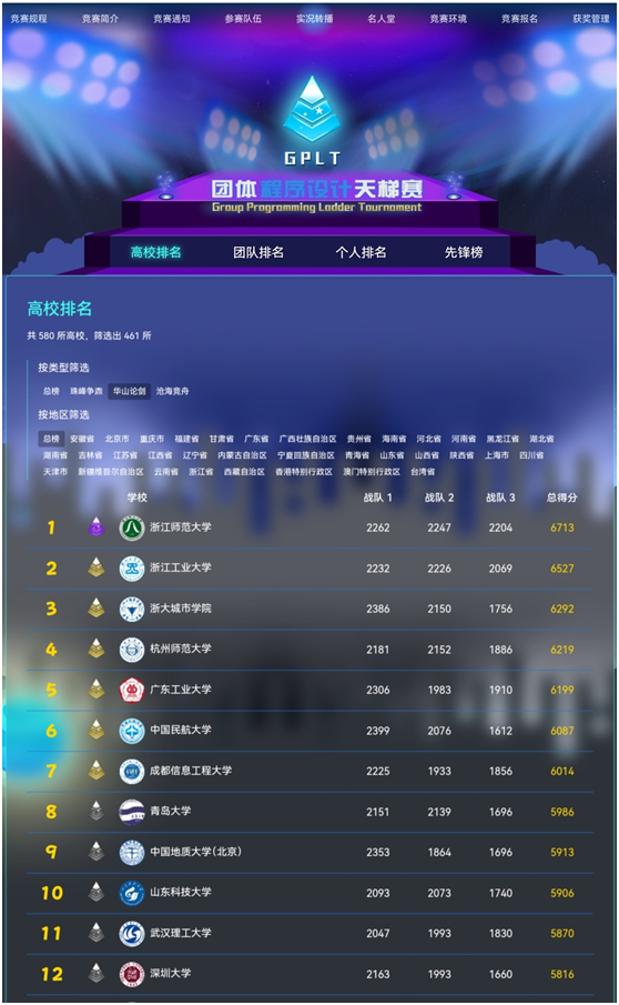 “中国高校计算机大赛-团体程序设计天梯赛”是竞赛星级较高的四星级竞赛,比赛分设珠峰争鼎、华山论剑和沧海竞舟三个组别。本次比赛全国共有580所高校、1865支团队参赛,其中华山论剑组参赛高校为461所。本次比赛,成都信息工程大学派出的三支战队共获得了6014分的高分,排名位列全国第7名,四川省第1名。