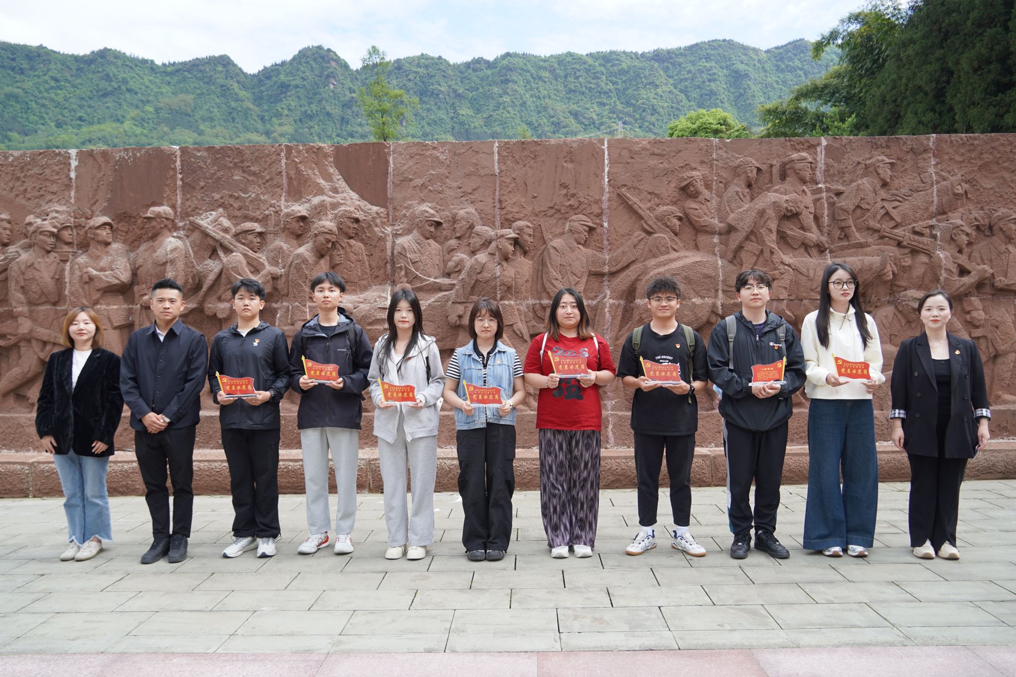 曹佳阳介绍了党员示范岗创建背景与意义,现场表彰了2024年度验收优秀的党员示范岗代表张川峰、崔子怡等,并为党员示范岗代表颁发奖品。随后,2025年度党员示范岗代表易伟、黎柄芮等8名同学郑重接过示范岗牌匾,肩负起先锋模范的责任与使命。在党员代表张川峰同志带领下,全体党员面向党旗重温入党誓词,铿锵誓言响彻纪念馆广场,彰显对党的忠诚与为共产主义奋斗的坚定信念。