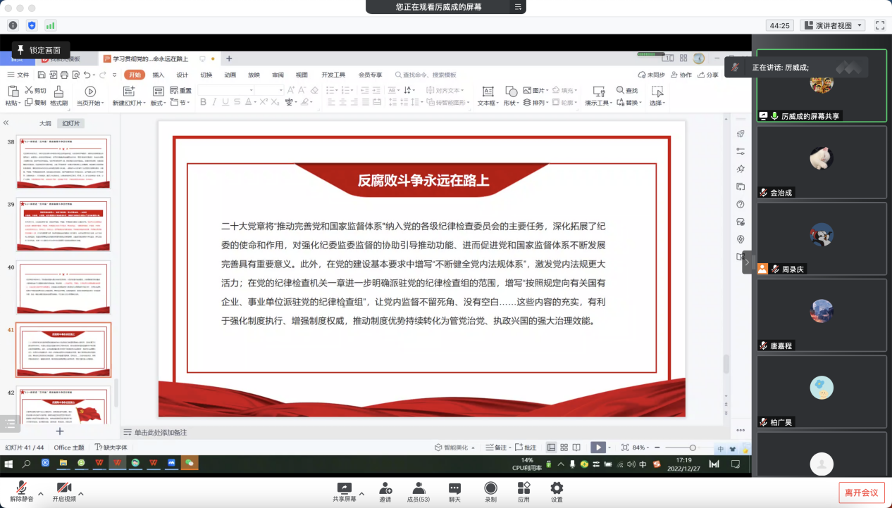 最后,厉威成希望各位党员在学习二十大精神时,能够不断牢记自我革命这一重要主题。不仅在工作学习上体现出党员的先进性,在青年时期更是要筑牢防腐拒变的思想。今后在工作岗位上,能够担当起责任,做一名合格党员。
