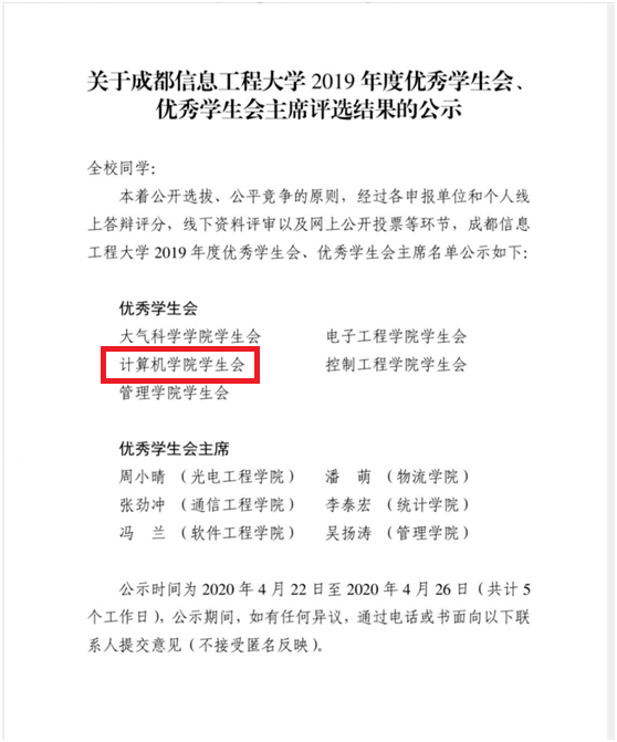 您所在的位置: 全球体育博彩公司排名榜单 >> 党建工作 >> 团建工作 >> 团情快讯 >> 正文 团情快讯 关于我院学生会荣获成都信息工程大学2019年度优秀学生会的通报 近日,我院学生会经过线上答辩评分,线下资料评审以及网上公开投票等环节,荣获成都信息工程大学2019年度优秀学生会的称号。 各级学生组织和学生干部将继续努力奋进,做好学校联系广大同学的桥梁和纽带,全心全意为同学服务,积极开展相关工作。 上一条:关于我院学生会荣获2019年度成都市优秀学生分会称号的通报 下一条:关于我院三下乡团队获奖情况的通报 【关闭】