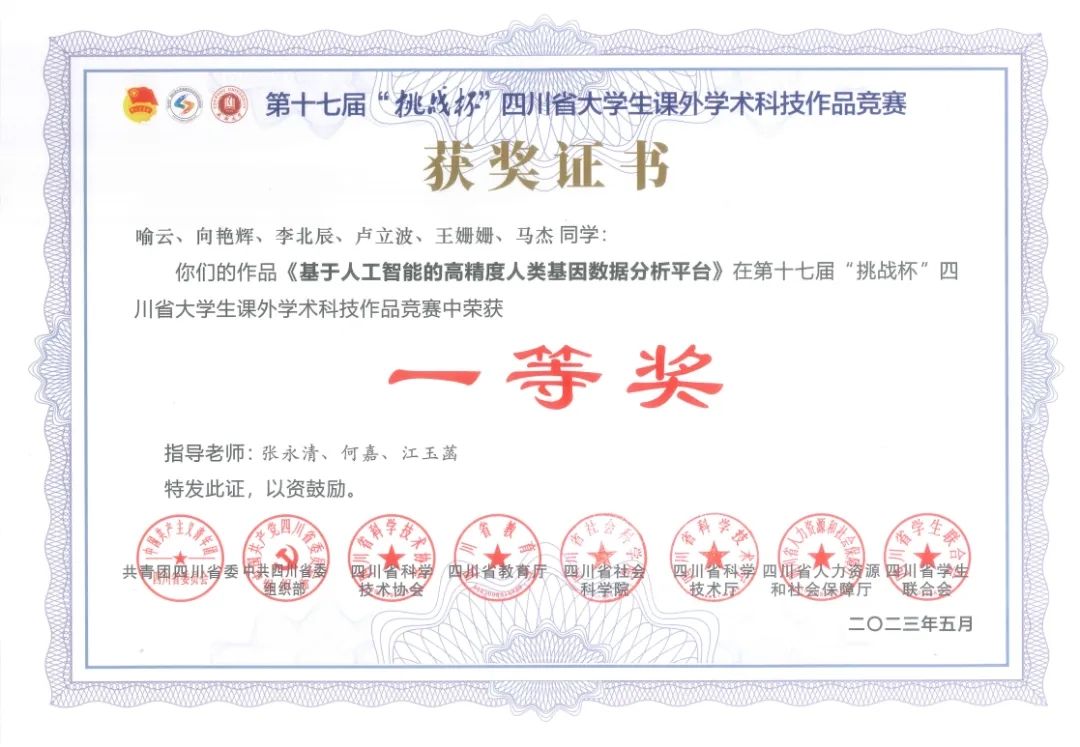 5月16日,四川省第十七届“挑战杯”大学生课外学术科技作品竞赛在成都大学圆满闭幕,我院学子的参赛作品《基于人工智能的高精度人类基因数据分析平台》(指导老师:张永清、何嘉、江玉菡),在1035件优秀作品中脱颖而出斩获一等奖(全省共109项),该项成绩是我院近年来在“挑战杯”大学生课外学术科技作品竞赛中取得的最好成绩。此外参赛作品《基于精准气象预报的卫星云图反演和订正技术研究》(指导老师:吴锡、杨善敏、李孝杰)荣获三等奖。